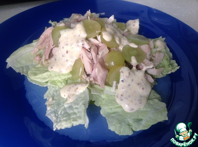 Салат с курицей и виноградомИзумительный салат, понравился безумно. В этом салате меня устраивает все. Сыр с плесенью заменила на сливочный мягкий, виноград был зеленый и вместо салата китайская капуста. Какой должен быть вкус в оригинале не знаю, но то что получилось это БЛЕСК!!!! Салат из капусты, запеченой курицы и грушиСалат понравился, сочный и нежный, неожиданно приятное сочетание груши и капусты порадовало