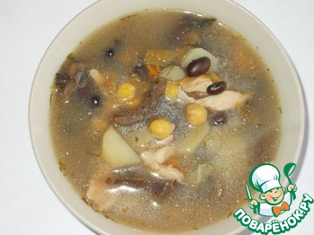 2. куриный грибной суп с фасолью и нутом http://www.povarenok.ru/recipes/show/82220/интересный суп получился, такой сложный вкус, даже трудно описать...... насыщенный грибной аромат маслят ( сушеные), + ореховый вкус нута за зубах, своеобразный вкус фасоли ( черная " Прето")+ куриный бульон, он правда не очень ароматный-и вот это все смешалось, настоялось, получилась  ...однозначно надо все это пробовать..нам понравилось....