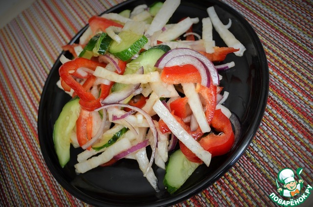 И ещё один салатик , тоже от Танюшки, но другой, от tatabilga-2015 . САЛАТ с ДАЙКОНОМ , ПОМИДОРАМИ и ОГУРЦАМИ , https://www.povarenok.ru/recipes/show/151943/.
